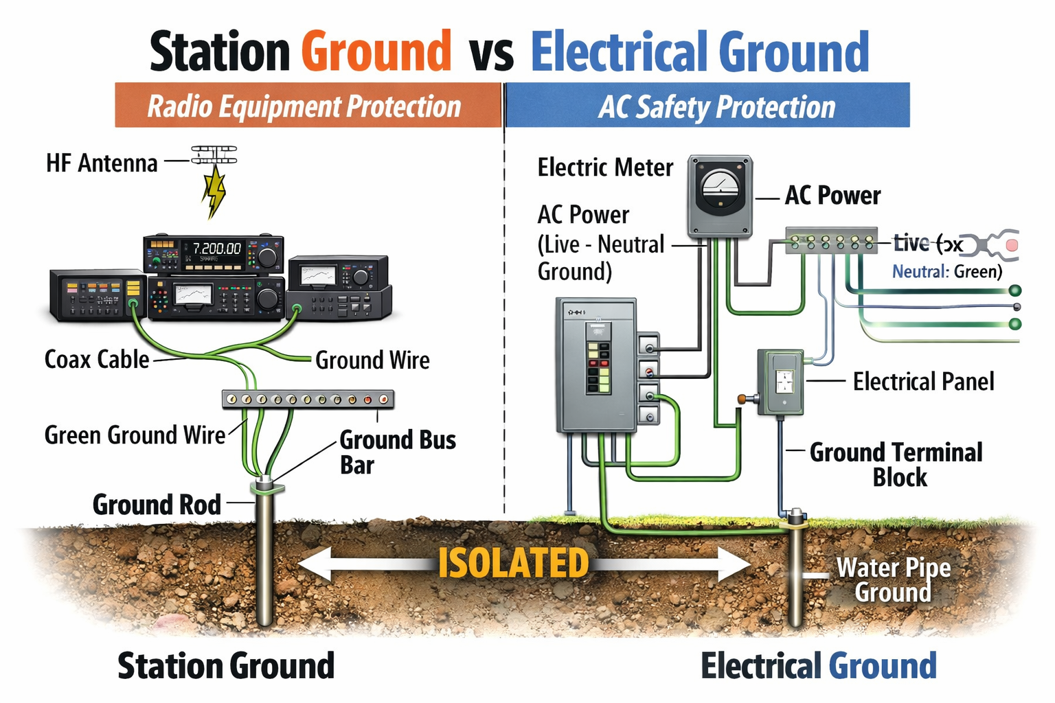 Station ground vs electrical ground are often treated as the same thing, but they serve completely different purposes in a radio installation. Understanding how they differ — and how they must work together — is essential for electrical safety, lightning protection, RF stability, and equipment protection.